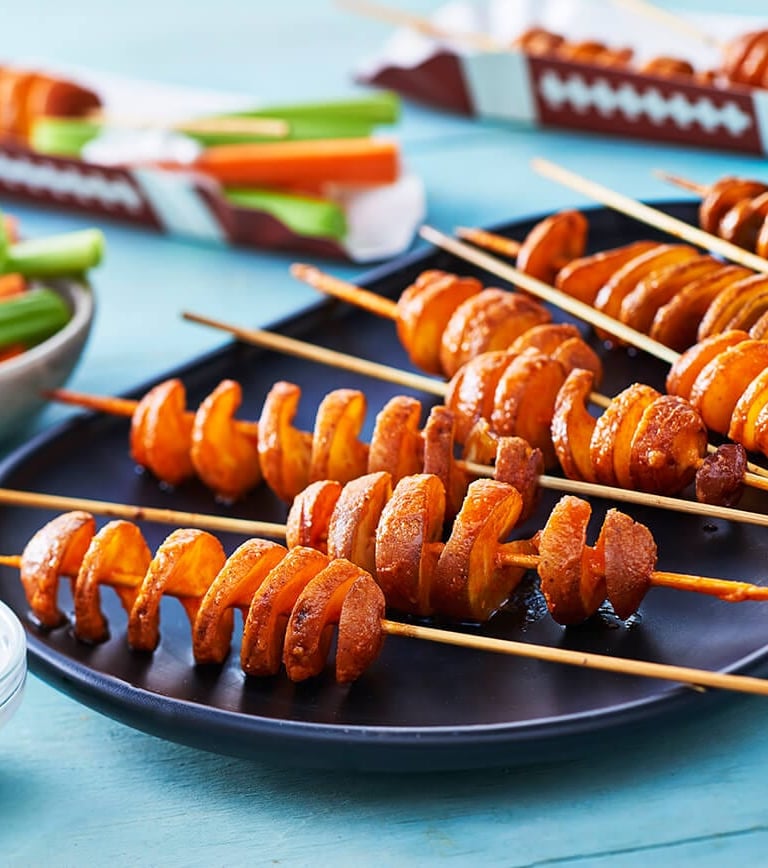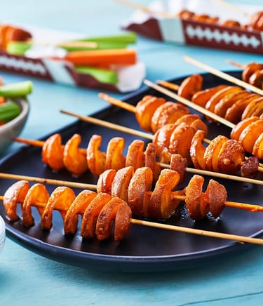 A tornado potato, or spiral potato, is a whole potato that has been spiral-cut onto a skewer and then deep-fried or baked until crispy. The spiral cuts are made by a special cutting tool or a knife, and the potato is stretched out on the skewer to create a tornado or twisting shape. After cooking, it is seasoned with various spices and is often eaten as a popular street food or snack.